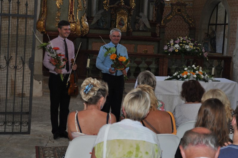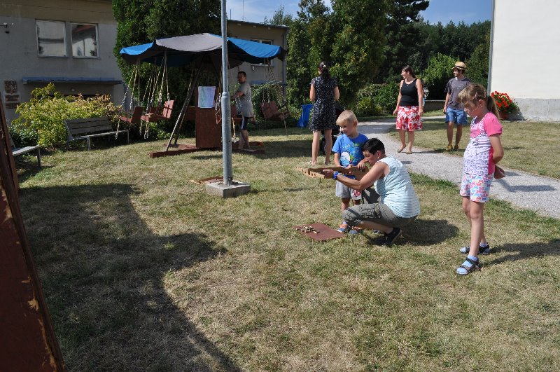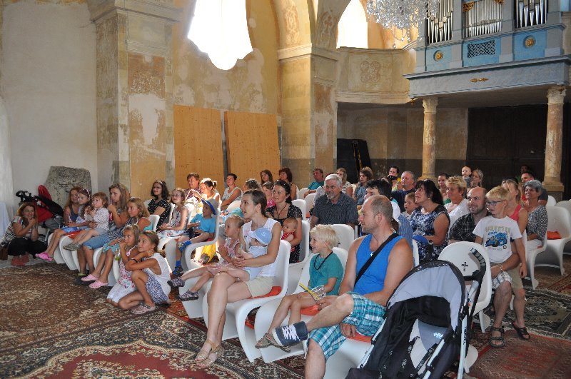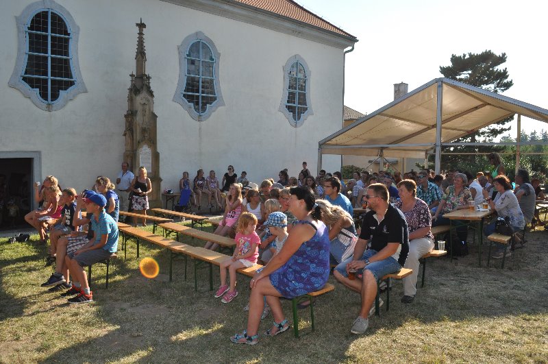 skupině Grál. Setkání doplnila možnost posedět ve stínu pod stanem a také bohaté občerstvení. „Plánovaná pohádka divadla Zvonek „Zvířátka a loupežníci“ se kvůli velkému horku přesunula do příjemně chladných prostor kostela, kde děti sledovaly příběh o tom, jak zvířátka svou chytrostí a odvahou přelstila v boji o chaloupku zlé loupežníky. Když zazvonil zvonec a pohádky byl konec, opět přišla na pódium středověká skupina Grál. Děti se v prostranství kostela nenudily: mohly se zdarma povozit na dobovém kolotoči, v dřevěné střelnici vyzkoušet svou šikovnost při střelbě z kuše nebo si v korálkové dílně vyrábět různé „parády“ pro radost,“ popisuje Z. Brádlová. Po 16 hodině se místa v kostele začala plnit posluchači, kteří se těšili na varhanní koncert Martina Strejce a
