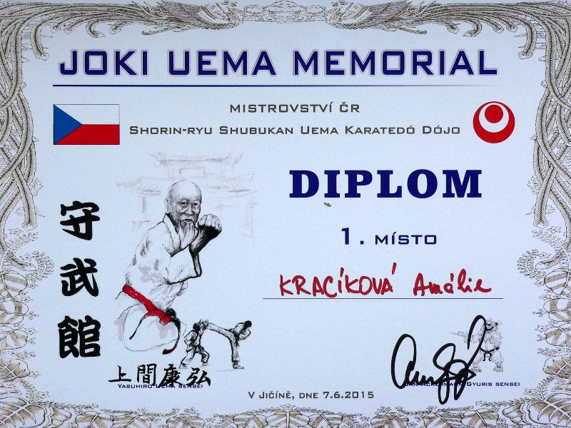 amalka titl JIČÍN –  Dnes se  v Jičíně uskutečnil 4. ročník Joki Uema Memoriálu, šampionátu nesoucího statut Mistrovství České republiky v tradičním okinavském karate. Soutěž, jejímž organizátorem je mezinárodní asociace Shorin-Ryu Shubukan Uema Karatedó Dójo, se již tradičně konala pod záštitou Velvyslanectví Japonska v ČR a Města Jičína. Z jičínských reprezentantů se nejvíce dařilo Amálii Kracíkové, která úspěšně obstála v těžké chlapecké konkurenci a obsadila 1. místo ve věkové kategorii 8-9 let, čímž úspěšně obhájila svůj loňský titul mistryně ČR.  Za Dobré zprávy gratulujeme!