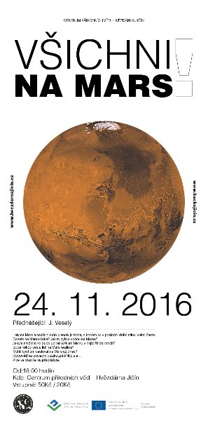 JIČÍN – Centrum přírodních věd – Hvězdárna Jičín zve 24. listopadu od 18 hodin na přednášku „Všichni na Mars“. Pořadatelé pozvali Mgr. Jana Veselého z Hvězdárny a planetária z Hradce Králové. „Lety na Mars a osídlení rudé planety, to je téma, o kterém se v poslední době mluví velmi často. Co nás na Marsu čeká? Jak to bylo s vodou na Marsu? Jakým směrem se bude ubírat výzkum Marsu v nejbližších letech? Bude někdy cesta lidí na Mars realitou? Kosmické sondy přinášejí podrobné snímky pořízené z oběžné dráhy i z povrchu planety, zkoumají atmosféru i mineralogické složení a chemické vlastnosti tamějších hornin. V podstatě už víme „do čeho jdeme.“ Mohli bychom cestovat na Mars už dnes? Odpověď na poslední otázku zní „ano“, je tu však i „ale“… Abyste se dozvěděli, jak to je, přijďte k nám na přednášku,“ zve pracovník jičínské hvězdárny David Vališka.
