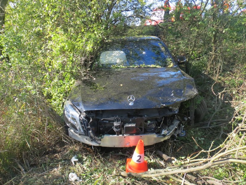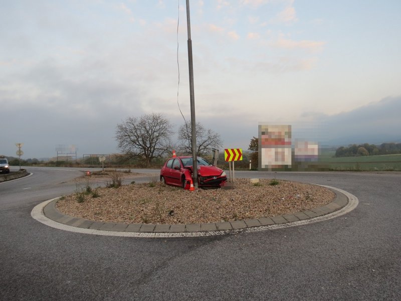 Kuriózní nehoda v Úlibicích: auto zabrzdilo o sloup objezdu