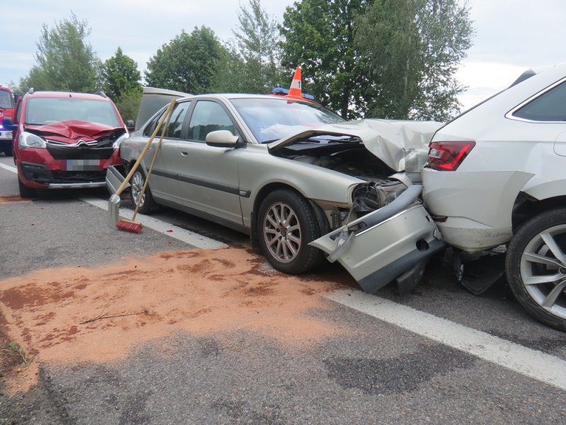 ÚLIBICE / Dřevěnice – V sobotu 17. srpna krátce před jedenáctou hodinou dopolední došlo k hromadné dopravní nehodě na silnici I. třídy číslo 16 za odbočkou na Dřevěnice ve stoupání ke kruhové křižovatce u Úlibic. Šestačtyřicetiletý Volva v tu dobu jel ve od Nové Paky na Jičín. Pravděpodobně se plně nevěnoval řízení a zřejmě ani nedodržel bezpečnou vzdálenost za před ním jedoucí Škodou Superb, kterou řídil jednačtyřicetiletý řidič. Ten kvůli situaci v silničním provozu zastavil na konci souvislé kolony stojících aut a následovala nevyhnutelná srážka. Škoda Superb navíc narazila do před ním stojící Mazdy. Tím to ale neskončilo: do havarovaného Volva zezadu narazil Citroen Berlingo, který řídil šestačtyřicetiletý muž. I v tomto případě s největší pravděpodobností hrála svoji vinu nepozornost. Při dopravní nehodě došlo ke zranění spolujezdkyň ze Škody Superb a řidiče Volva. Ani jeden z řidičů nebyl pod vlivem alkoholu, celková škoda odhadem přesáhla 400 tisíc korun. Přesnou příčinu dopravní nehody a míru zavinění policisté dál šetří.