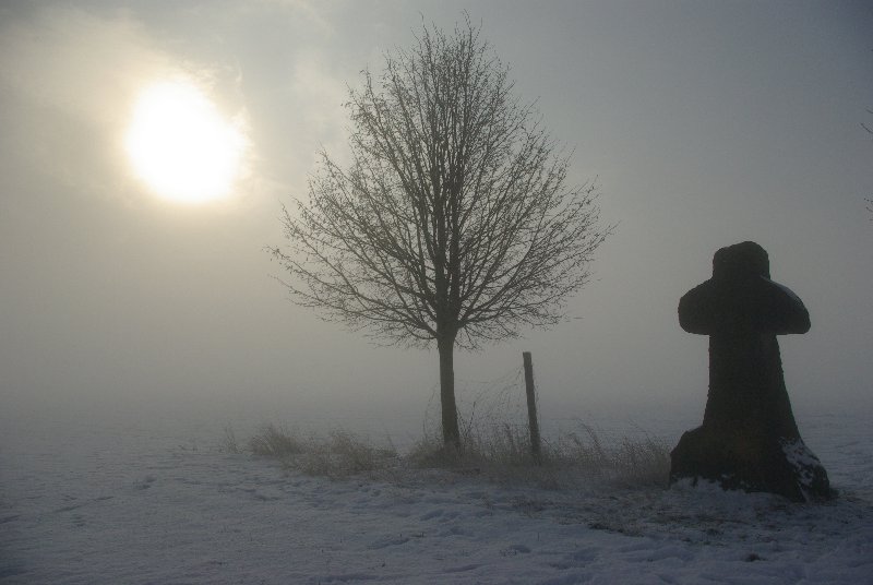 Stopy ve sněhu dnes mizely v mlze, aby se pak potkaly u bezmála třímetrového smírčího kříže, který podle návrhu profesora AVU Miloše Šejna vytvořil Aleš John.  Kříž   byl  vytesán z hořického pískovce, na dvou stranách nese letopočty úmrtí obou mužů: 1629 (M. Burnatius)  a 1728 (T. Svoboda). Na hřbetu vrchu  Veliše  stojí  od září 1999,  jeho odhalení se uskutečnilo 14. září při ekumenickém setkání Smíření. V jeho bezprostřední blízkosti, v lokalitě „U spravedlnosti“  kdysi  stávala šibenice.  Při naší  návštěvě  bylo  podle stop ve sněhu a dvou vyhořelých kahánků  zjevné, že se tam lidé vydávají i  jindy  než jen u příležitosti výročí  vztyčení smírčího kříže.