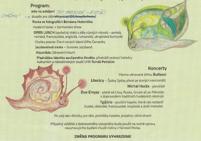 PECKA – Pro lidi všech generací, národností a vyznání bude 21. května od 10:00 do 22:00 hodin otevřena Farní zahrada v městyse Pecka. Program slibuje divadlo, tanec, fotografie Pecky od Bohdana Holomíčka, muziku, přednášky, barmanskou show, filozofii, teologii, poezii. K tomu Open Lunch s ochutnávkou tradičních jídel národů, které žijí v Pecce a okolí. Případný výtěžek z dobrovolného vstupného bude použit na nutné opravy nevyhovujícího bydlení vybrané rodiny z farnosti Pecka.