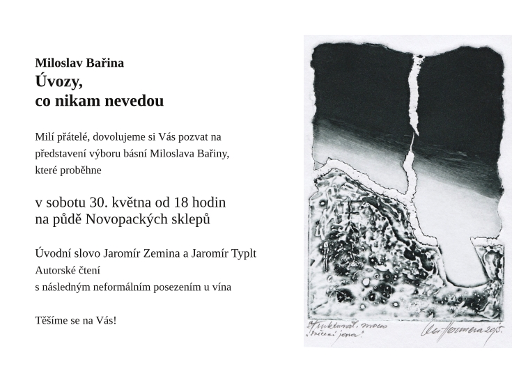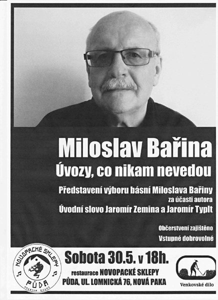 NOVÁ PAKA / Pecka – Právě vyšel výbor básní novopackého básníka a známého máchologa Miloslava Bařiny. V kapesním formátu A6 je ideálním čtením zejména pro poutníky krajinou Podkrkonoší a Podbezdězí. Uvedení sbírky se uskuteční 30. května od 18 hodin v Novopackých sklepích a 19. června v Muzejní kavárně v Bělé pod Bezdězem. „Je to drobná knížečka, ale básničky moc pěkné, stejně srdeční je i doslov Jaromíra Zeminy. Verše jsou rozkmitané od transcendentna po dětskou bezelstnost. Doplňující dvě ilustrace jsou od Oldřicha Hamery, prý jediného žáka Vladimíra Boudníka a kamaráda Bohumila Hrabala,“ přiblížila knížku poezie Věra Kociánová, která nakladatelství Venkovské dílo zastupuje.