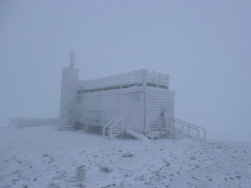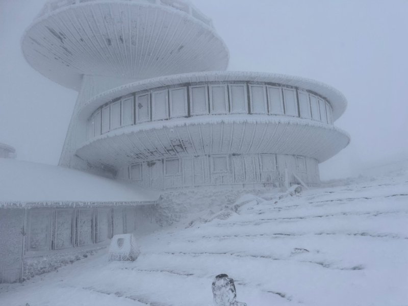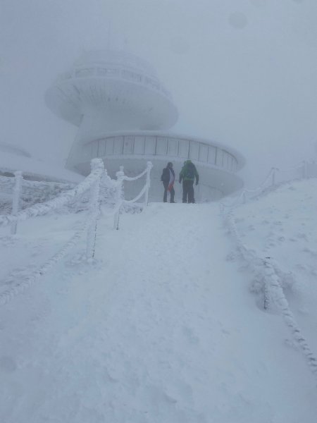 img-20251030-wa0003 Start výpravy v Peci pod Sněžkou byl poklidný a výprava v plné síle rozvinula vlajku před bistrem Café Gril. Na společné fotce byli účastníci v plné síle, a tak vyrazili směrem k Obřímu dolu.  Už tam potkali první sníh a bylo zřejmé, že dosáhnout na vrchol nebude jednoduché. Kolemjdoucí je dokonce varovali, že vrchol je nedostupný a že ze Sněžky se stala bílá pevnost. Když výprava dosáhla Slezského domu, potýkala se už se silným větrem a vánicí. Na vrcholu Sněžky vanul vítr o síle 100 km/hod. a teplota spadla na -2 stupně Celsia, avšak pocitová teplota se kvůli vlhkosti a větru dostala až na -17 stupňů.