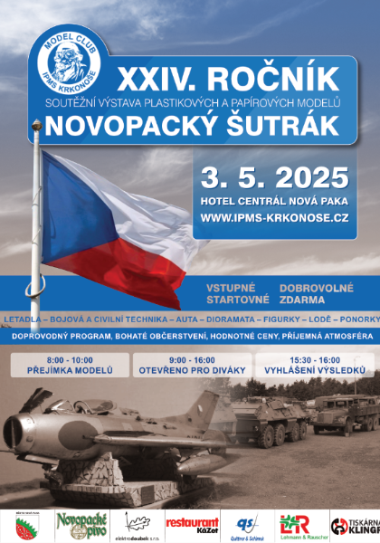 novopackysutrak2025 NOVÁ PAKA  –  Soutěžní výstava plastikových a papírových modelů Novopacký Šutrák 2025 se pod záštitou starosty Města Nová Paka koná v sobotu 3. května v hotelu Centrál na novopackém Masarykově náměstí. Přejímka modelů se uskuteční od 8  do 10  hodin, ukončení a vyhlášení výsledků bude od  15.30  do 16  hodin. Pro diváky bude otevřeno od 9 do 16 hodin.  Startovné je zdarma, vstupné dobrovolné. Občerstvení je v místě konání soutěže zajištěno.
