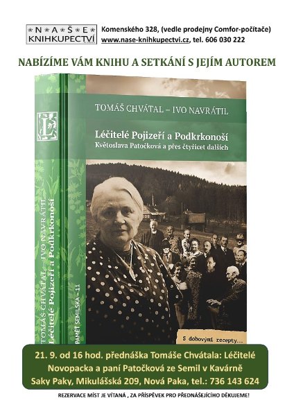 2025-lc3a9c48ditelc3a9 NOVÁ PAKA –  Pře Kavárnou Saky Paky v Nové Pace začne v neděli 21. září v 16 hodin přednáška doktora Tomáše Chvátala: Léčitelé Novopacka a paní Květoslava Patočková ze Semil.