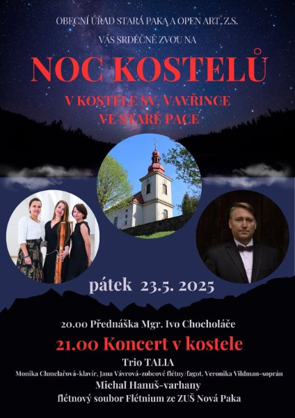 • 21:00 – kostel sv. Vavřince ve Staré Pace (vystoupí i varhaník Michal Hanuš a soubor Flétnium ze ZUŠ Nová Paka)