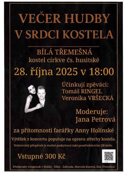 Bílá Třemešná – Přijďte si užít jedinečný večer hudby v úterý 28. října 2025 od 18:00 ve Sboru církve československé husitské v Bílé Třemešné. Vystoupí talentovaní zpěváci Tomáš Ringel a Veronika Vršecká. Výtěžek z koncertu poputuje na opravu střechy kostela. Je to slibný začátek pro další budoucnost kostela Církve československé husitské, který v první řadě potřebuje novou střechu, na níž už místní vyhlásili sbírku. Dobrovolný příspěvek lze poskytnout také prostřednictvím OR kódu.