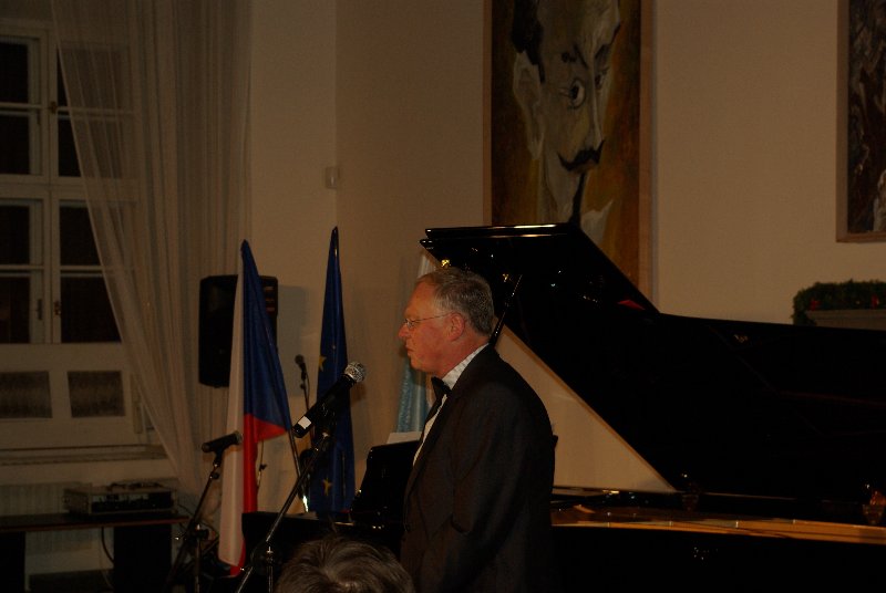 Pan starosta stál ve dveřích s chotí a každému podávali ruku. To bylo pěkné, ale nehygienické, ale slušelo se to. Pavel Krčmárik hrál na klavír za 1,7 milionů skvěle. Potvrdila to sousedka, která tomu rozumí. Předpověděl jsem, že ve třetím vstupu bude hrát Ježka. Hrál Bugatistep. Začal jsem si fandit.