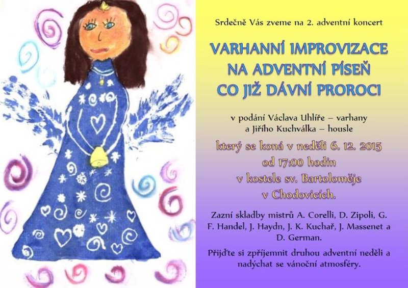 12274695_538539912977374_4326720503882961795_n HOLOVOUSY / Jičínsko  –   Holovousští  zvou na  2.  adventní  koncert  varhanní  improvizace  na  adventní píseň  „Co již dávní proroci“  v podání Václava Uhlíře na varhany a Jiřího Kuchválka na housle. Koná se  v  neděli 6. prosince od 17:00 hodin  v  kostele sv. Bartoloměje v Chodovicích.  „Přijďte si zpříjemnit druhou  adventní neděli a nadýchat se vánoční atmosféry,“ vzkazují pořadatelé a zvou  i na další dva koncerty 12. a  19. prosince, opět v chodovickém kostele.