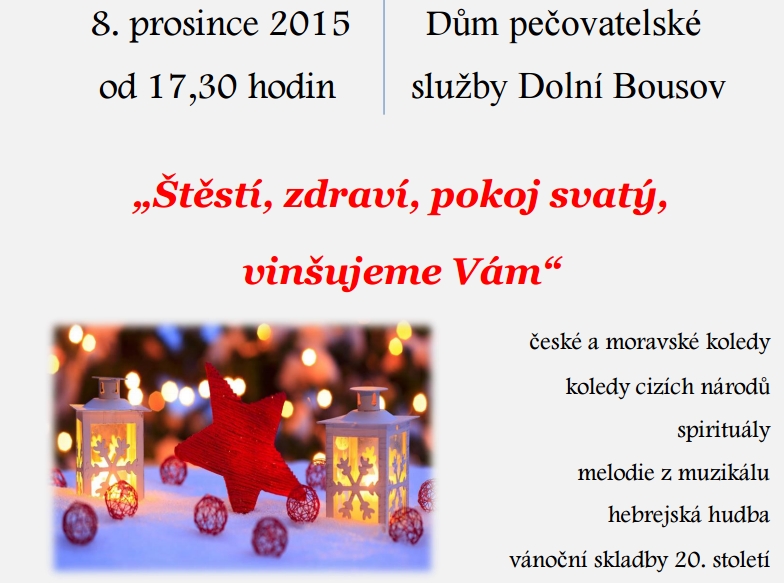 DOLNÍ BOUSOV –  „Jedná se o vánoční muzicírování, neboli jakési besídky pro naše seniory. Je to již tradice, že pro ně vždy v době adventu připravíme společné odpoledne, kde si společně zazpíváme známé české koledy z celé naší země a pro jejich potěchu zazpíváme i další nejen vánoční skladby z našeho repertoáru,“ informovala Pavlína Těšínská, sbormistryně pěveckého tělesa Bendl-Stojmír.  Vše  prý bude  umocněno vůní kávy, čaje a napečeného cukroví. „Setkání pořádáme pro Dům s pečovatelskou službou v Sobotce a pro Dům s pečovatelskou službou v Dolním Bousově,“ dodala sbormistryně. Další koncert se koná 13. prosince v Mladějově, 20. prosince bude na hradu Kost, 27. prosince v kostele sv. Kateřiny v Dolním Bousově a na závěr 3. ledna 2016 se chystá novoroční koncert v kostele sv. Máří Magdalény v Sobotce.
