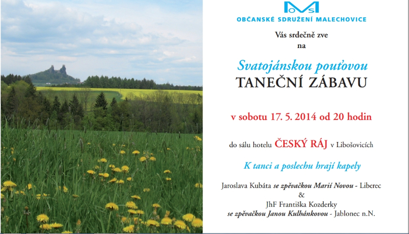 dovolujeme si Vás co nejsrdečněji pozvat na tradiční malechovickou Svatojánskou pouť – tentokrát netradičně ve formě májové taneční zábavy. Ač nám budou hrát dvě vynikající kapely a mladé tanečnice se svými partnery z Jičína nám předvedou, jak se správně tancuje, tanec je, samozřejmě, nepovinný. Nejcennější je, jak dobře víte, vzájemné setkání. Výbornou hudbu můžete ocenit i poslechem (podrobněji níže v PS od našeho vzdělavatele a jazzmena Františka Kozderky). Těšíme se na Vás v sobotu 17. května 2014 od 20 hodin v hotelu Český ráj v Libošovicích!