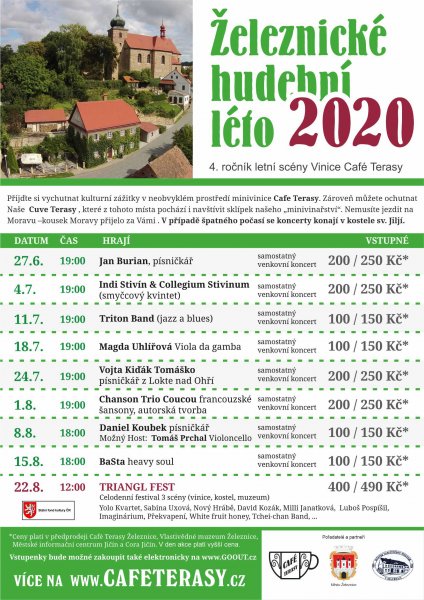 ŽELEZNICE – Vychutnávat kulturní zážitky v neobvyklém prostředí minivinice Café Terasy v Železnici můžete i letos, i když to ještě v závěru května moc nadějně nevypadalo. V rámci Železnického kulturního léta se tam koná už čtvrtý ročník letní scény. „V sobotu se uskutečnilo další letošní hudební setkání – Indi Stivín v doprovodu souboru Stivinum. Byl to mimořádný koncert, který uváděla Alice Springs, která má k Železnici i osobní vztah, protože se tady narodila. Byl to umělecký vrchol našeho kulturního snažení, přálo nám počasí a dokonce byla i hojná účast, devadesát pět procent bylo přespolních. Nadcházející sobotu 11. července od 19 hodin zahraje TRITON band, parta muzikantů, která se dala dohromady za účelem občasného společného provozování hudby pro vlastní potěchu a pobavení posluchačů,“ přibližuje letošní dění Radek Řehák, zástupce pořadatelů. Na sobotním koncertu zazní převzaté písničky, které si členové přinesli ze svých domovských kapel a je široce rozkročený od swingu přes blues až k folku a country. Domovskou scénou kapely je hronovská „obskurní vínovna Triton“. Kapela hraje převážně v tomto složení: Jiří „Kača“ Zocher – zpěv, banjo, kytara, kornet, Jarda Kučera – zpěv, el.kytara, Milan Prchal – zpěv, kytara, foukací harmonika, Miloš Novotný – zpěv, kytara, banjo, Vojta Polej – tenorsaxofon, klarinet a Karel Šourek – kontrabas.