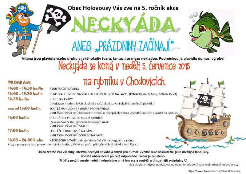 neckyada CHODOVICE /Holovousy –  Zveme vás všechny, kterým nechybí odvaha a smysl pro humor. Zveme také nesoutěžící jako diváky a fanoušky. Bohaté občerstvení najdete po celé odpoledne i večer v neděli 5. července u rybníku v Chodovicích. Přijďte prožít veselé nedělní odpoledne plné legrace a soutěží a tím zahájit prázdniny. Svá plavidla můžete nahlašovat na obecním úřadě či na e-mail: obec@holovousy.cz  https://www.facebook.com/ObecHolovousy