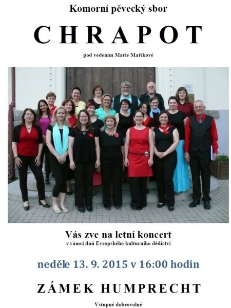 chrapot HUMPRECHT /  TURNOV –  Letošní Dny evropského kulturního dědictví  se konají od 5. do 13. září,  národní téma pro letošní ročník je: „Památky znovuzrozené“. V Dobrých zprávách jsme přijali dvě pozvánky z  Českého ráje. První vás nasměruje na zámek Humprecht u Sobotky,  kde se v neděli 13. září od 16 hodin uskuteční koncert Komorního pěveckého sboru CHRAPOT z Mělníka. Vstupné je dobrovolné. Pro posluchače je to i dobrá příležitost zámek navštívit a zároveň si  prohlédnout výstavy. Jedna z nich je věnovaná 110 letům železnice 1905-2015 a je k vidění do konce letošní sezóny ve druhém poschodí zámku. Připravil ji nadšený sběratel a železnici oddaný „nádražák“ Kamil Brož z Lomnice nad Popelkou. V zámecké věži pokračuje výstava k historii trampingu v Českém ráji. Vzniklo tam malé muzeum Spojených osad údolí Nebáku.  Ve druhém poschodí zámku na vás čeká výstava papírových modelů hradů, zámků, kostelů, věží či rozhleden, které zhotovila Helena Čmelíková z Dolního Bousova.