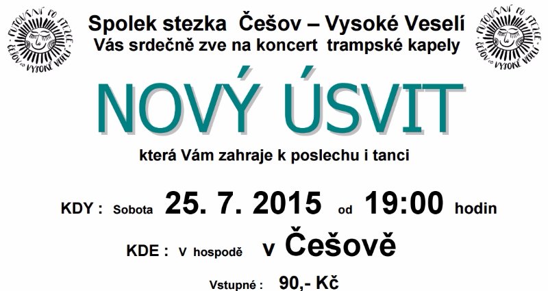 ČEŠOV – Do obce na Vysokoveselsku se opět po roce vrací večer s trampskou muzikou. Pořadatelem setkání, které bude v sále češovské hospody v sobotu 25. července od 19 hodin, je Spolek stezka Češov – Vysoké Veselí. K poslechu i tanci zahraje tradičně kapela Nový Úsvit z Prahy. Občerstvení bude zajištěno, ve vnitřních prostorách se nekouří. Tyto večery již mají dlouholetou tradici a kamarádskou atmosféru, kdy je možné se uvolnit, odpočinout si, pobavit se a zazpívat si nebo jen tak relaxovat a načerpat pohodu. „Předejte prosím, pozvání i svým přátelům, kamarádům, známým,“ vzkazují za pořadatele Iva Labaštová a Pavel Hlavatý a těší se na vás.