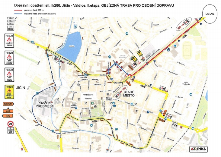 objizdky JIČÍNSKO – Královéhradecký kraj začíná 26. září  s  první etapou rekonstrukce frekventované silnice č . II/286  z  Jičína  na  Železnici. Letos bude opravena  jen první část, a to kruhový objezd v lipách  a  prvních  800  metrů silnice v Revoluční ulici.  „Město Jičín chtělo předejít dopravním komplikacím, proto vystavělo v  lokalitě  Kasárna  provizorní komunikaci, která vede dopravu  v  jednom směru,  z  Valdic do Jičína. S  rekonstrukcí dalších částí  chce  Kraj  pokračovat až na jaře příštího roku,“ informovala  mluvčí  jičínské  radnice Magda Doležalová. O přípravě objízdné trasy jsme v DZ  informovali  na:  http://zpravyceskyraj.cz/pro-objizdnou-trasu-od-valdic-se-stavi-provizorni-silnice/