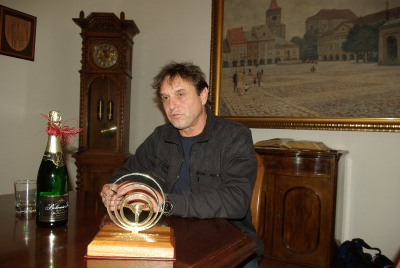JIČÍN – Úspěch autokrosaře Václava Fejfara ocenil na jičínské radnici starosta Jan Malý. Sedmapadesátiletý jezdec, kterému se v 38. ročníku celostátní ankety podařilo již počtvrté za sebou „ovládnout“ kategorii Zlatý volant v autokrossu a rallyekrossu, se vloni stal kontinentálním vicemistrem v kategorii Touring autokross. Zlatý volant převzal 16. prosince, dnes odpoledne si trofej prohlédl jičínský starosta. Pozvání k neformálnímu rozhovoru využily i Dobré zprávy a některé zajímavosti zaznamenaly zvukově: