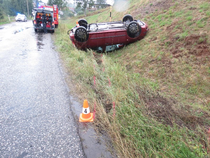 ROŠKOPOV – K jedné z nehod došlo v neděli 6. září odpoledne v Roškopově, kde šestačtyřicetiletá řidička osobního auta Škoda Fabia dostala zřejmě vlivem nepřiměřené rychlosti jízdy na mokrém povrchu vozovky smyk, který nevyrovnala a následně vyjela vpravo mimo vozovku, kde se přetočila na střechu. Alkohol u lehce zraněné řidičky vyloučila dechová zkouška. Celková škoda byla vyčíslena na 50 tisíc korun.