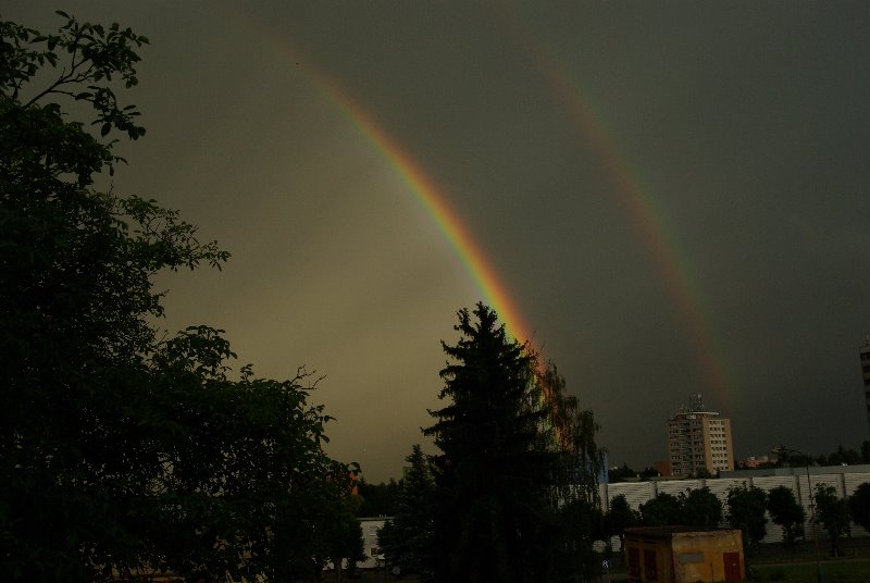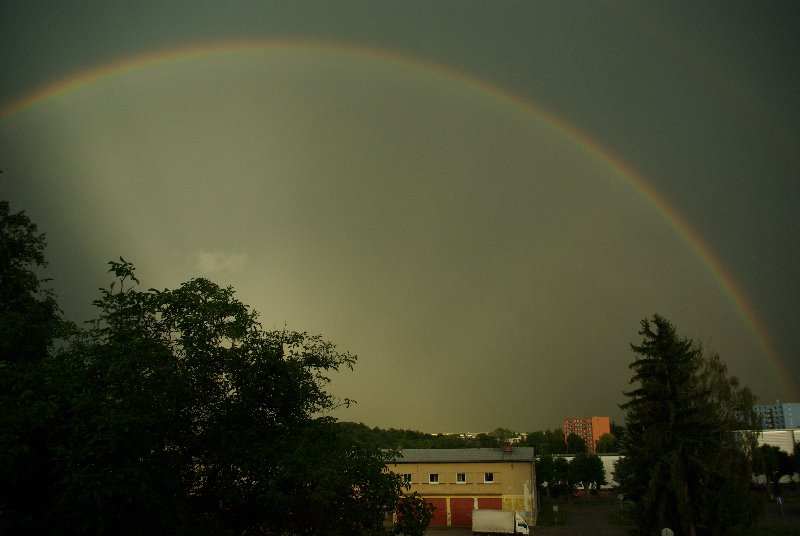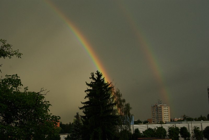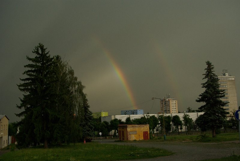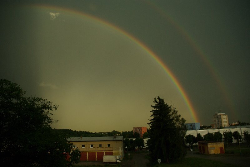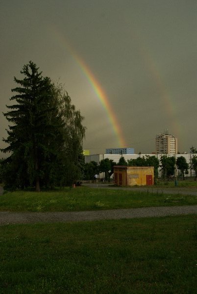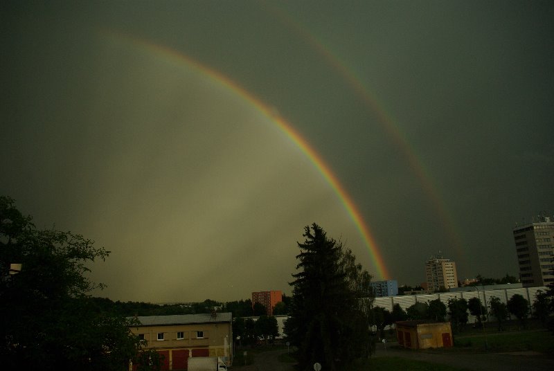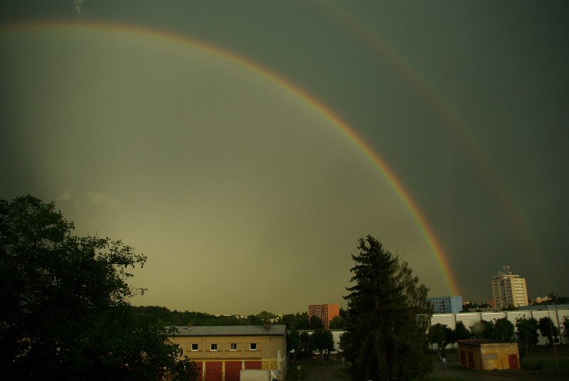 titulka JIČÍN –  Dnes vpodvečer před bouřkou navštívil Jičín oblíbený optický úkaz.  Pohledem  z Čeřovky opásala dvojí duha  sídliště U stadionu a později se šinula i na Šibeňák. Řečeno odborně, avšak zjednodušeně: duha je fotometeor (optický úkaz), který se projevuje jako skupina   soustředných barevných oblouků, které vznikají  lomem a vnitřním odrazem slunečního nebo měsíčního  světla na vodních kapkách v atmosféře. V dešťové kapce může dojít nejen k jednomu, ale k více odrazům světelného paprsku. Při dvou vnitřních odrazech  je možné pozorovat druhou, tzv. sekundární neboli  vedlejší duhu.  Říká se jí  také  dvojitá duha. Sekundární duha se objevuje nad první a bývá také obvykle výrazně slabší než primární duha. Snad je tento optický jev ze snímků zřejmý. V jeho režii vypadají i siluety panelových domů přívětivěji.