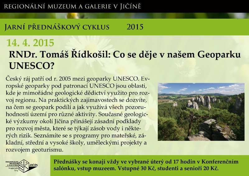geopark JIČÍN / ČESKÝ RÁJ – Co se děje s Geoparkem UNESCO, na to dá odpověď poslední přednáška z jarního cyklu  Regionálního muzea a galerie v Jičíně. Koná se v úterý 14. dubna od 17 hodin v Konferenčním salónku Valdštejnského paláce v Jičíně. Hostem bude RNDr. Tomáš Řídkošil,  ředitel obecně prospěšné společnosti  Geopark Český ráj. Český ráj patří od r. 2005 mezi geoparky UNESCO. Tedy mezi oblasti, kde je mimořádné geologické dědictví využito pro rozvoj regionu.