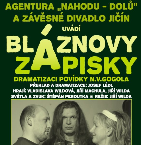 foto JIČÍN/ Valdická brána  –  Letošní festival Mezi patry na Valdické bráně v  Jičíně přináší oproti původním plánům změnu, kterou zřejmě neocení ti, kteří se chystali navštívit představení „Třicet devět stupňů“. To mělo premiéru a první reprízy v září loňského roku.  Tehdy se však na mnoho žádostivých diváků nedostalo. Z neočekávaných organizačních důvodů je však Závěsné divadlo letos v tomto ohledu nemůže uspokojit. „Rozhodli jsme se  proto, že letošní festival doplníme reprízami hry  Nikolaje Vasiljeviče  Gogola „Bláznovy zápisky“. Při této příležitosti  jsme pro zájemce připravili diváckou soutěž o tři volné lístky. Opět  ji  zprostředkují  Dobré zprávy,“ informuje  herec Závěsného  divadla  Jiří Machula: