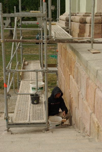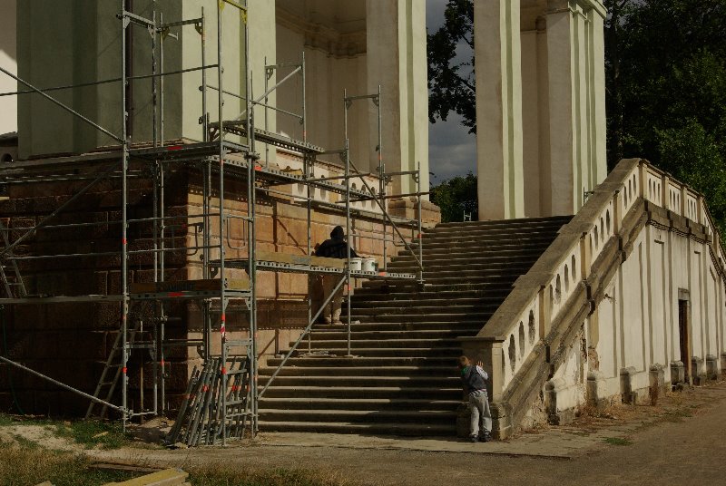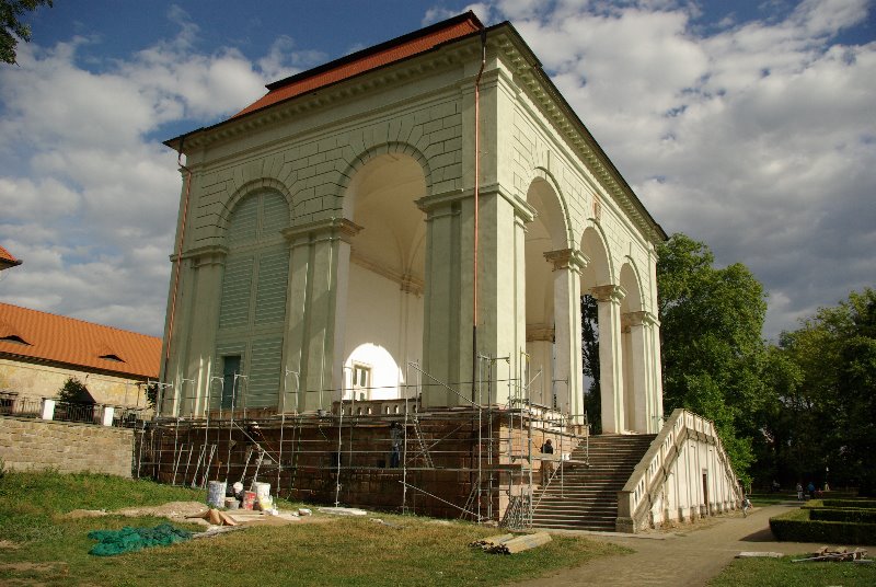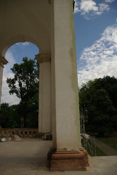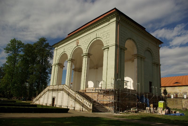 lodžie Potěmkinovu vesnici. „Sloupy mají nátěr jen zpředu. Po stranách a vzadu je všechno při starém, novou výmalbu potřebuje i část s klenbou. Nevypadá to pěkně. Fasáda je flekatá. Proč tak polovičaté řešení?“ ptá se jičínský občan Josef K. „Termínu Potěmkinova vesnice bych oponoval, takové označení by „sedělo“ například na dřívější stav K-klubu na Valdštejnově náměstí: opravená fasáda, ale dovnitř zatékalo. Fasáda lodžie byla v havarijním stavu, opadávala. Buď jsme mohli památku oplotit, aby tam nikdo nevstupoval nebo se pokusit najít peníze na opravu toho nejkřiklavějšího. Když jsme pak zpracovávali projekt, tak jsme netušili, že se nám nakonec podaří dokončit všechny tři strany. Byli bychom samozřejmě rádi, aby se brzy dostalo i na zbývající plochy, aby světle zelená barva mohla vyšisovat v časovém souladu s letošním novým nátěrem,“ vysvětlil místostarosta Petr Hamáček. Opravy památky začaly letos v dubnu, práce, které provádí firma GEMA ART GROUP a.s. z Prahy, skončí v závěru října.