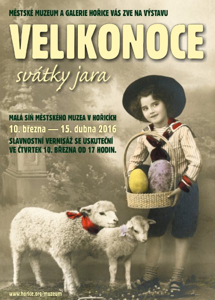 pozv_vel HOŘICE – V Malé síni hořického muzea  přivítají  ve čtvrtek 10. března od 17 hodin svátky jara výstavou PhDr. Milady Ryšánkové, etnografky a bývalé ředitelky Muzea Podkrkonoší v Trutnově. Výstava bude mít sekci křesťanského pojetí Velikonoc s odrazem ve výtvarném umění a s ukázkou liturgických předmětů a knih. Větší část výstavy je věnovaná lidovým zvykům a tradicím, nemohou tedy  chybět pomlázky, kraslice, jidášky, staročeský vytlačovaný perník, smrtka a líta, s nimiž chodily dívky o Smrtné neděli po koledě. Vše samozřejmě s doprovodnými texty. Výstavu ve čtvrtek zahájí úvodním slovem autorka M. Ryšánková  a hudebním vystoupením žáci Základní umělecké školy Hořice.