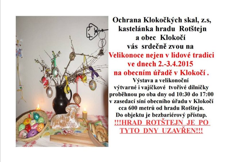 ROTŠTEJN, KLOKOČÍ – S ohledem na počasí mění pořadatelé své plány a zcela ruší velikonoční program na hradě Rotštejn! Výstava v Klokočí bude přístupná. O změně informovala kastelánka hradu Hana Talli Hlubučková. Nepřehlédněte však druhou pozvánku, která upozorňuje, že se na Obecním úřadě v Klokočí konají „Velikonoce nejen v lidové tradici“ (600 metrů od hradu Rotštejn) a to 2. a 3. března.