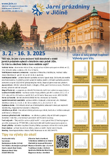 Veškerý program a přehled toho, co je vždy v daném týdnu v Jičíně možno navštívit a využít najdete na https://www.jicin.org/jarni-prazdniny-v-jicine