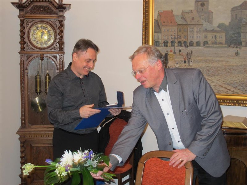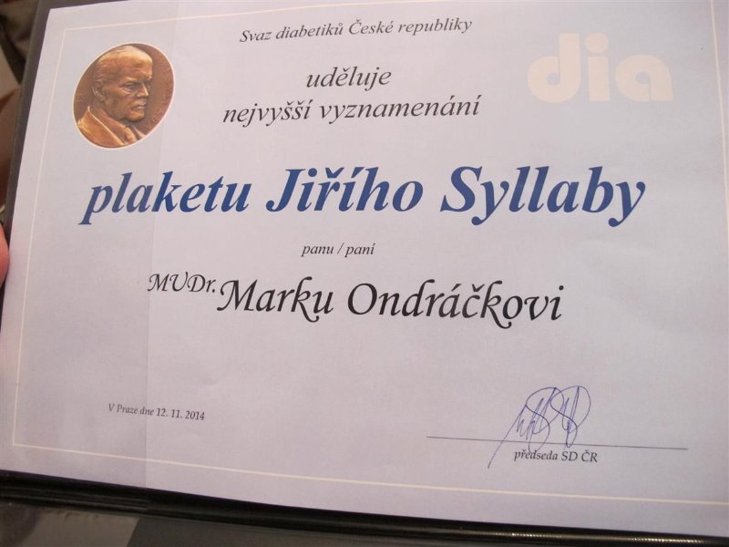 JIČÍN – Svaz diabetiků České republiky ocenil práci jičínského lékaře MUDr. Marka Ondráčka. Ten dnes odpoledne na jičínské radnici převzal plaketu Dr. Jiřího Syllaby, kterou mu spolu s členy jičínského klubu diabetiků předal starosta Jan Malý. Jičínský diabetolog MUDr. Ondráček tak získal uznání nejenom za svou dlouholetou praxi v diabetologii, ale také za nezištnou pomoc pro Svaz diabetiků, se kterým dvě desítky let spolupracuje, pořádá přednášky nebo nabízí pro veřejnost měření hladiny cukru v krvi zdarma. Měření podporuje město tím, že bezplatně zapůjčuje zasedací místnost úřadu a přispívá 10 tisíci korun ze svého rozpočtu na činnost klubu diabetiků.