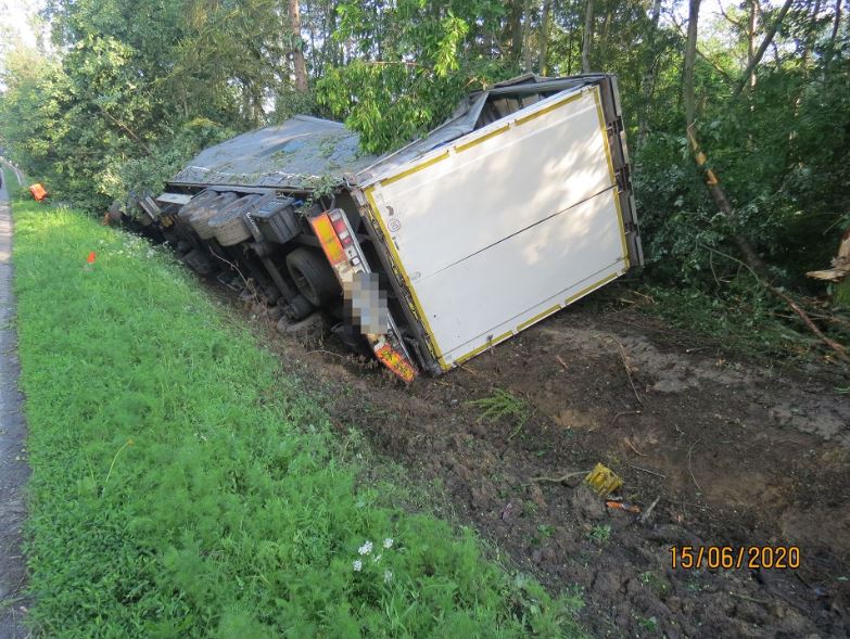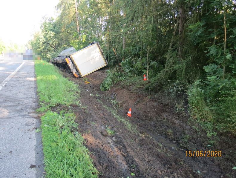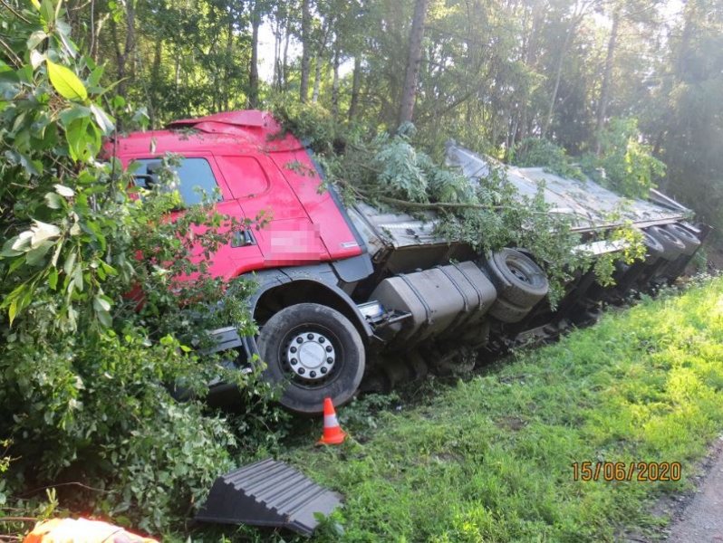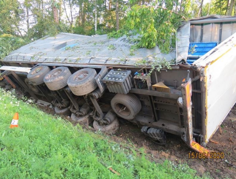 SAMŠINA / Ohařice – V pondělí 15. června krátce před sedmou hodinou ranní jel jednašedesátiletý řidič nákladního auta Scania s návěsem od Jičína na Mladou Boleslav. Za Ohařicemi se zřejmě plně nevěnoval řízení a plynule sjel vpravo mimo silnici do příkopu. Tam poškodil několik vzrostlých stromů a náletové dřeviny. Auto se nakonec zastavilo částečně na pravém boku, náklad se vysypal a poškodil. Zraněného řidiče do nemocnice transportoval vrtulník letecké záchranné služby. Alkohol policisté na místě vyloučili provedenou dechovou zkouškou. Celková škoda je předběžně vyčíslena na 1,5 milionu korun. Havarovaný a už přeložený kamion se podařilo vyprostit krátce před jednadvacátou hodinou. Nehodu dál šetří jičínští dopravní policisté.