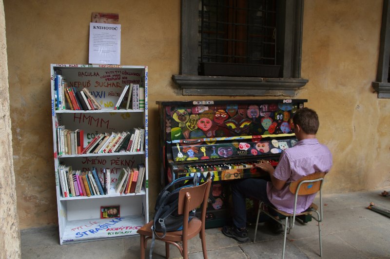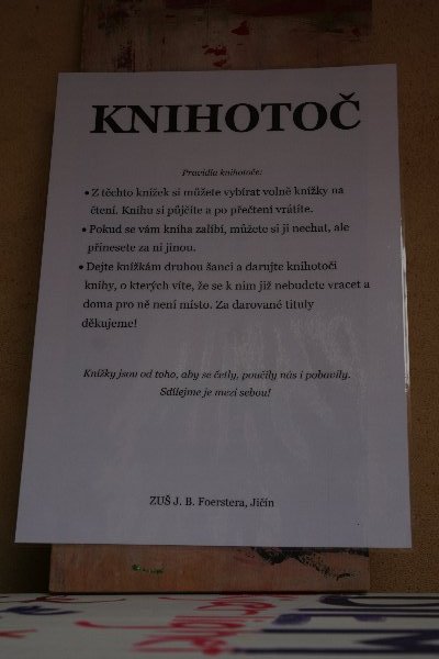 JIČÍN – Muzejní nádvoří Valdštejnského paláce v Jičíně je samé překvapení. Kromě sochy Albrechta z Valdštejna, která od loňského května shlíží a dohlíží na návštěvníky, jsou tam i další příležitosti k dívání, k poslouchání, ke koncertování, preludování nebo k výpůjčce literatury ve specifické nádvořní knihovně. Piano, které dosud sloužilo v podloubí k hudebním kratochvílím, je čerstvě omalované od žáků jičínské základní umělecké školy a již nastavuje klávesy k venkovní hudební produkci. Letos mu nově dělá společnost takzv. Knihotoč, který může potěšit žádostivé čtenáře. Zároveň však dává knížkám druhou, ale možná i padesátou šanci….Pravidla tohoto koloběhu knih zní: