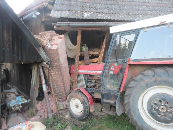 JIČÍNSKO / Staňkov – V neděli 31. května odpoledne kolem páté hodiny řidič traktoru s přívěsem zastavil na silnici v obci Staňkov a vystoupil. Vůz však řádně nezajistil, a ten se ze svahu samovolně rozjel. Traktor přejel přes louku a narazil do stodoly u obytného domu. Dechová zkouška na alkohol u 45letého řidiče byla negativní. Nehoda se obešla bez zranění. Škoda na traktoru činí 20.000 korun, na stodole je odhadována na 50.000 korun. Policisté na místě uložili řidiči pokutu tisíc korun.