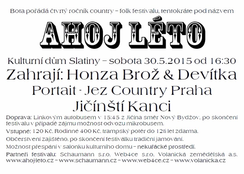 ČEŠOV / SLATINY – Přátelé, kamarádi, zvu vás na již čtvrtý country-festiválek „Ahoj léto“, který pořádám na té naší malé dědině. Letos musíme vzít za vděk azylem o dvě vesnice dále – v sále kulturního domu ve Slatinách. Festiválek se uskuteční 30.5. od 16:30 (začátek navazuje na příjezd autobusu z Jičína, odjezd 15:45 směr Nový Bydžov). Jubilejní pátý ročník se vrátí zpět do Češova.