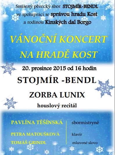 KOST/ Český ráj – O čtvrté adventní neděli si užijte zklidnění na hradě Kost. Od 16 hodin se v hradní kapli uskuteční koncert smíšeného sboru Bendl-Stojmír, který je společně se správou hradu Kost a s rodinou Kinských del Borgo pořadatelem Vánočního koncertu. „Pro sbor i pro diváky to bude zážitek i díky, troufnu si říci, až magickému prostředí hradní kaple. Je to milé zastavení ve vánočním shonu a v přípravách na blížící se Štědrý den,“ zve Pavlína Těšínská, sbormistryně pěveckého tělesa Bendl-Stojmír. Průvodního slova koncertu se ujme Tomáš Grindl, na klavír doprovodí učitelka Petra Matoušková, se svým houslovým