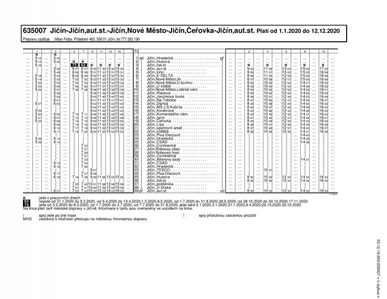 titulka JIČÍN  –   Novým provozovatelem  Městské hromadné dopravy v Jičíně  je  od 1.ledna 2020 firma Milan Fejfar, která zvítězila ve výběrovém řízení.  Smlouva o dopravní obslužnosti bude desetiletá.  Město Jičín  vypsalo veřejnou zakázku na poskytování služby vloni, protože dohoda s firmou BusLine a.s. vypršela k 31. prosinci 2019.  S novým dopravcem souvisí i nový jízdní řád, který zohledňuje časté požadavky občanů. Jízdní řád je dostupný na webu města a je vylepený na všech zastávkách.  Počítá se s jeho každoročním vyhodnocováním  a  s  možnými změnami. MHD v Jičíně je zajištěna do roku 2029.