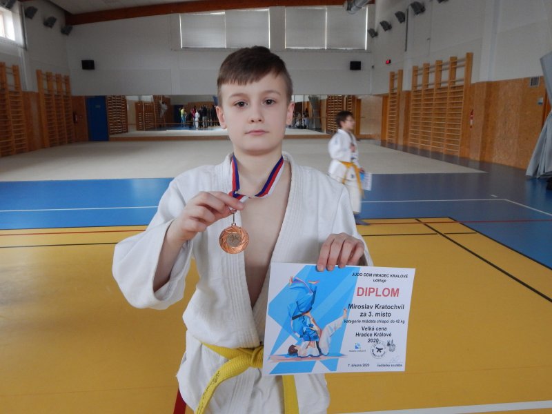 dscn7647 HRADEC KRÁLOVÉ  /   Jičín   –   Ve sportovní hale Třebeš v Hradci Králové se uskutečnil 7. ročník Velké ceny DDM Hradce Králové v judu pro kategorie U 11, 13, 15 a U 18 dorostenky.  Na královéhradecké tatami se představilo i několik jičínských nadějí. Nejlépe se dařilo v kategorii U 11 do 42 kg Mirku Kratochvílovi, který po solidním výkonu získal bronzovou medaili.  Na 4. místě v kategorii U 13 do 30 kg obsadil Marek Jelínek. V nejsilněji obsazené kategorii do 38 kg skončil Honza Egrt pátý, když sporným výkonem rozhodčích podlehl v semifinále a v boji o bronz pak velkému favoritovi soutěže, který v 1. kole vyřadil jičínského Tomáše Orta. Ve stejné hmotnostní kategorii na svého soupeře nestačil Štěpán Lánský.  Na 7. místech skončili v kategorii U 13 do 42 kg Kryštof Neuwirth, v kategorii U 15 do 38 kg František Ptáček a v téže věkové kategorii do 46 kg Vojta Ježek.