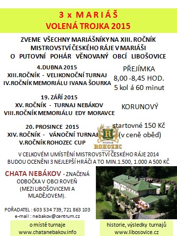 LIBOŠOVICE / ČESKÝ RÁJ – 13. ročník Velikonočního turnaje v mariáši a zároveň 4. ročník Memoriálu Ivana Šourka se hlásí o svá jarní karbanická práva…Pořadatelé zvou na 4. dubna do chaty Nebákov v Podtroseckých údolích a na pozvánce zároveň informují i o dalších dvou letošních turnajích, které si ti, jimž v ruce šustí karty, mohou již dnes zapsat do diáře.
