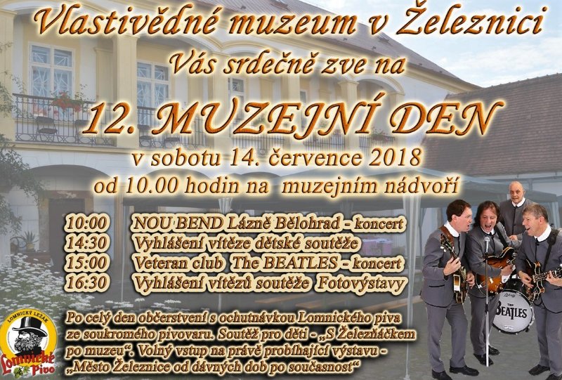 ŽELEZNICE – Vlastivědné muzeum v Železnici zve na 12. Muzejní den, který se uskuteční 14, července od 10 hodin na muzejním nádvoří. Kromě koncertů (Nou Band Lázně Bělohrad a Veteran club The Beatles) vyhlásí muzejníci výsledky dětské soutěže a soutěže Fotovýstavy, V patře muzea si návštěvníci mohou prohlédnout výstavu Město Železnice od dávných dob po současnost a ochutnat Lomnické pivo ze soukromého pivovaru.