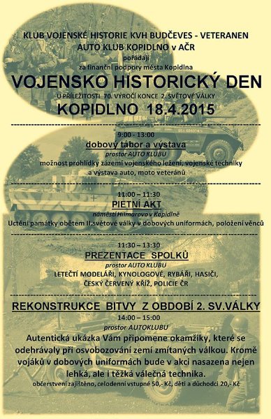 KOPIDLENSKO – První „Vojensko-historický den“ v Kopidlně v sobotu 18. dubna připomene padlé ve druhé světové válce a neblahé dějinné události ožijí prostřednictvím autentické bitevní ukázky. Podle pořadatelů z Klubu vojenské historie Budčeves – Veteranen a Autoklubu Kopidlno bude však na prvním místě pieta. Program začne v 9 hodin ráno v areálu autoklubu, kde návštěvníci uvidí ukázku vojenského ležení. V 11 hodin přítomní v zámeckém parku uctí památku lidí, kteří padli ve druhé světové válce. Odtud se pak účastníci vrátí zpátky do autoklubu, kde svou prezentaci v půl dvanácté zahájí místní letečtí modeláři, kynologové, hasiči a rybáři. Představí se také Policie ČR a Český červený kříž. Rekonstrukce bitvy, které se zúčastní bojová technika, začne ve 14 hodin. Na místě si návštěvníci mohou prohlédnout i repliku těžkého německého tanku Tiger. (plakátek zvětšíte kliknutím)