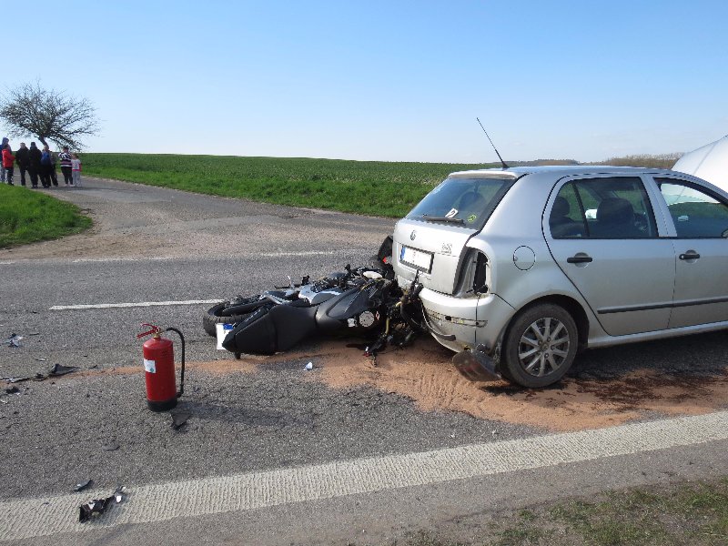 BARTOUŠOV – K jedné z nehod došlo v neděli 19. dubna odpoledne u obce Jičíněves. Sedmadvacetiletý řidič, který jel na motocyklu Honda ve směru od Bartoušova na Jičín zřejmě vlivem nepřiměřené rychlosti jízdy narazil u odbočky na obec Keteň do Škody Fabia, jehož řidička odbočovala vlevo a dávala přednost protijedoucímu autu. Alkohol u motocyklisty, který utrpěl lehké zranění, na místě vyloučila dechová zkouška. Celková škoda byla vyčíslena na 160 tisíc korun.