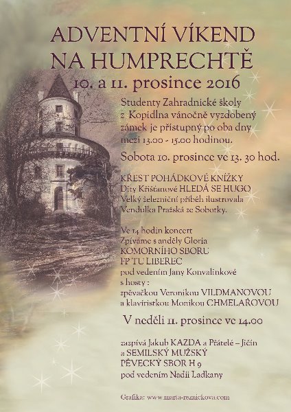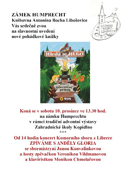 pospis LIBOŠOVICE / HUMPRECHT  –  Uvedení nové knihy  a  CD v  Knihovně Václava Bocha  doplní i vyprávění někdejšího mladičkého praktikanta lesnické školy o povinné praxi na loveckém zámečku Nová Louka v Jizerských horách ( v letech 1945 – 1947). Setkání se Koná se v sobotu 3. prosince  od 16 hodin. Hostem bude Josef  Špůra,  autor knihy  „Na loveckém zámečku“. „Poutavé vyprávění doplňuje řada dobových fotografií a autorovy perokresby,“ dodala libošovická knihovnice Alena Pospíšilová, která zároveň přiložila pozvánky na třetí adventní víkend na zámku Humprecht.  V sobotu 10. prosince a v neděli 11. prosince bude  pro návštěvníky připravený vánočně vyzdobený zámek a příjemný kulturní program.