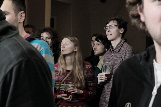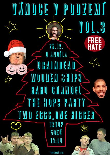 JIČÍN / Anděl – Známý růžový „andělský“ podnik na Valdštejnově náměstí v Jičíně hostil „Vánoce v podzemí III.“ Podle ohlasů – s třítýdenním odstupem – se tradiční vánoční večírek povedl. Jak avizovali pořadatelé: „Krom špatné hudby, sprostého kalení, nahoty, násilí a flambovaného ovoce budou i křtiny a debut!“ A to se z většiny naplnilo ve společnosti The Hops Party, Wooden Ships, Baro Chandel, Braindead-CZ a nováčka na hudebních prknech Two eggs, one bigger. Jak se ví, fotograf Ondřej Březovský dokáže mimořádně dobře zachytit atmosféru i pro ty, kteří absentovali a jsou zvědaví nebo jsou jen zvědaví. Díky, Ondro, za tvé oko, cit a zvědavost!