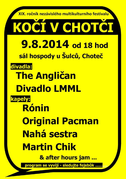 CHOTEČ – Již 19. ročník mysteriózní akce (jak ji označují pořadatelé) se koná v Chotči u Nové Paky v sobotu 8. srpna od 18 hodin. Čeká vás vibrující atmosféra premiér, které jsou zároveň derniérami, neočekávané happeningy, očekávané návraty, stále překvapující legendy…To je tradice, která nezklame. Pořadatelé zvou na další zážitek napříč všemi divadelními a hudebními směry. Po předešlých ročnících nezdařilých pokusů o hudební kulisu náročného sálu se organizátoři rozhodli, že zvuk obstará profi firma s dvěma techniky a s jedním mistrem zvuku. Osvětlení jest též zajištěno. K dispozici bude osvěžené alko i nealko, tradiční hospodské občerstvení (párky, klobásy, guláš, venkovní posezení atd.). Jistě uvítáte i nekuřácké prostředí sálu (kouřit se může v hospodě nebo venku na terase) a také možnost netradičního přespání/nocleh s dobrodružstvím. Stanové přespávání bylo třeba hlásit předem na facebook.