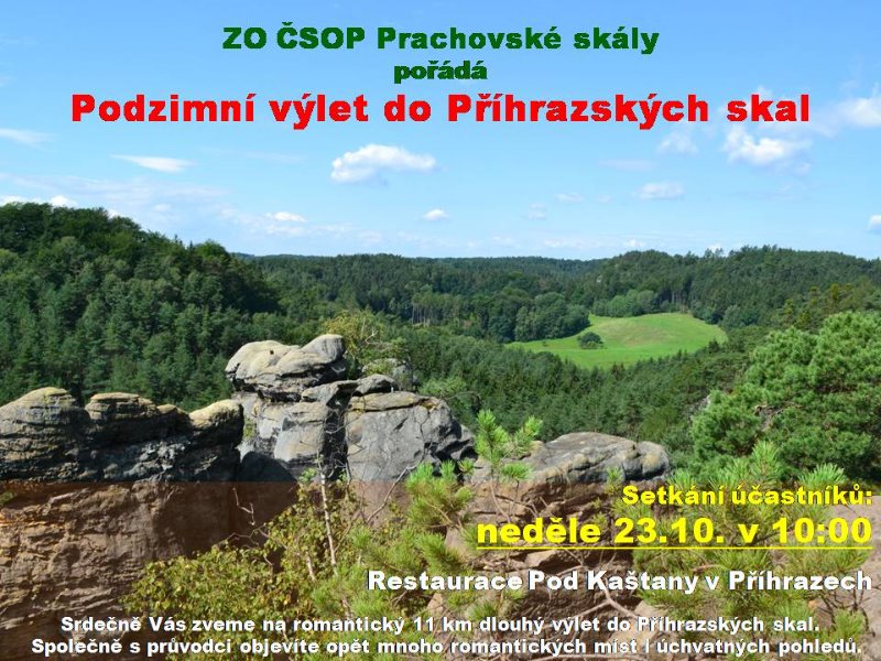 ČESKÝ RÁJ – Základní organizace ČSOP Prachovské skály zve na podzimní výlet do Příhrazských skal, který pořádá v neděli 23. října. Setkání účastníků je tentokrát v 10:00 hodin dopoledne před restaurací Pod Kaštany v Příhrazech. „Příhrazské skály prozářené pestrou paletou barev začnou v těchto dnech nabízet nové, jinak skryté pohledy. Společně s průvodci tak opět objevíte mnoho nádherných zákoutí a dechberoucích výhledů. Předpokládaná délka výletu je jedenáct kilometrů a návrat do Jičína je naplánován na půl páté vpodvečer,“ přibližuje základní informace Jiří Krupka za ZO ČSOP Prachovské skály.