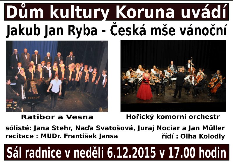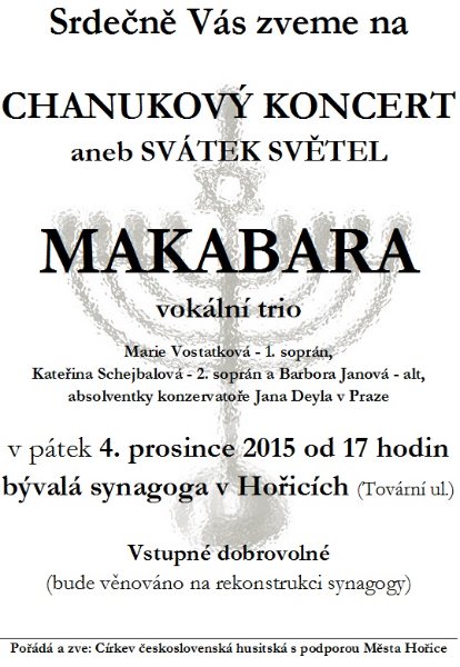 HOŘICE – Církev československá husitská Vás zve 4. prosince od 17 hodin na Chanukový koncert v bývalé synagoze v Hořicích. Vstupné je dobrovolné a podpoří rekonstrukci synagogy. Další hudební zážitek nabízí divadelní sál hořické radnice 6. prosince od 17 hodin. Rybovu Českou mši vánoční předají pěvecké sbory Ratibor a Vesna a Hořický komorní orchestr.