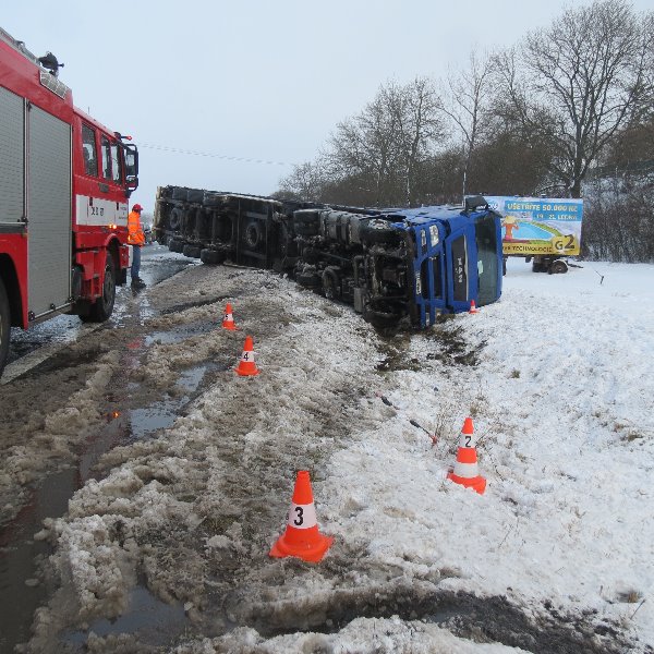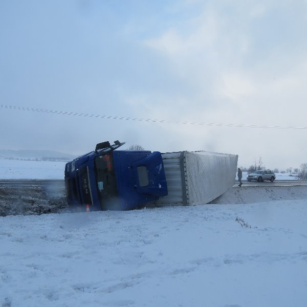 JIČÍNSKO – Ve středu 4. ledna došlo na Jičínsku k šesti dopravním nehodám, při kterých byly dvě osoby lehce zraněny. Celková škoda byla vyčíslena na nejméně 140 tisíc korun. K jedné z nehod došlo krátce po deváté hodině dopolední na obchvatu Jičína. Osmatřicetiletý řidič nákladního vozu Man s návěsem, který jel ve směru od Úlibic na Mladou Boleslav, dostal na přímém úseku zřejmě vlivem nepřiměřené rychlosti jízdy smyk, který nevyrovnal a vyjel vpravo mimo silnici, kde se přetočil o 180 stupňů a poté se převrátil na levý bok. Při nehodě nebyl nikdo zraněn. Alkohol u řidiče vyloučila dechová zkouška, celková škoda byla vyčíslena na 65 tisíc korun.