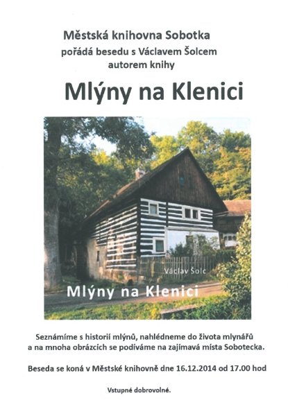 SOBOTKA – Kulturně- společenské dění v Sobotce otevřou dvě lednová setkání. 16. ledna od 17 hodin začne v sobotecké městské knihovně beseda s Václavem Šolcem, autorem nově vydané knihy „Mlýny na Klenici“. Nabízí historii mlýnů i připomenutí života mlynářů. „Šrámkovské matiné“ se otevře v neděli 18. ledna ve 14 hodin v sále sobotecké spořitelny. Literární pořad se tradičně koná u příležitosti výročí narození soboteckého básníka Fráni Šrámka. Český spisovatel, novinář a dramatik se v Sobotce narodil 19. ledna 1877.